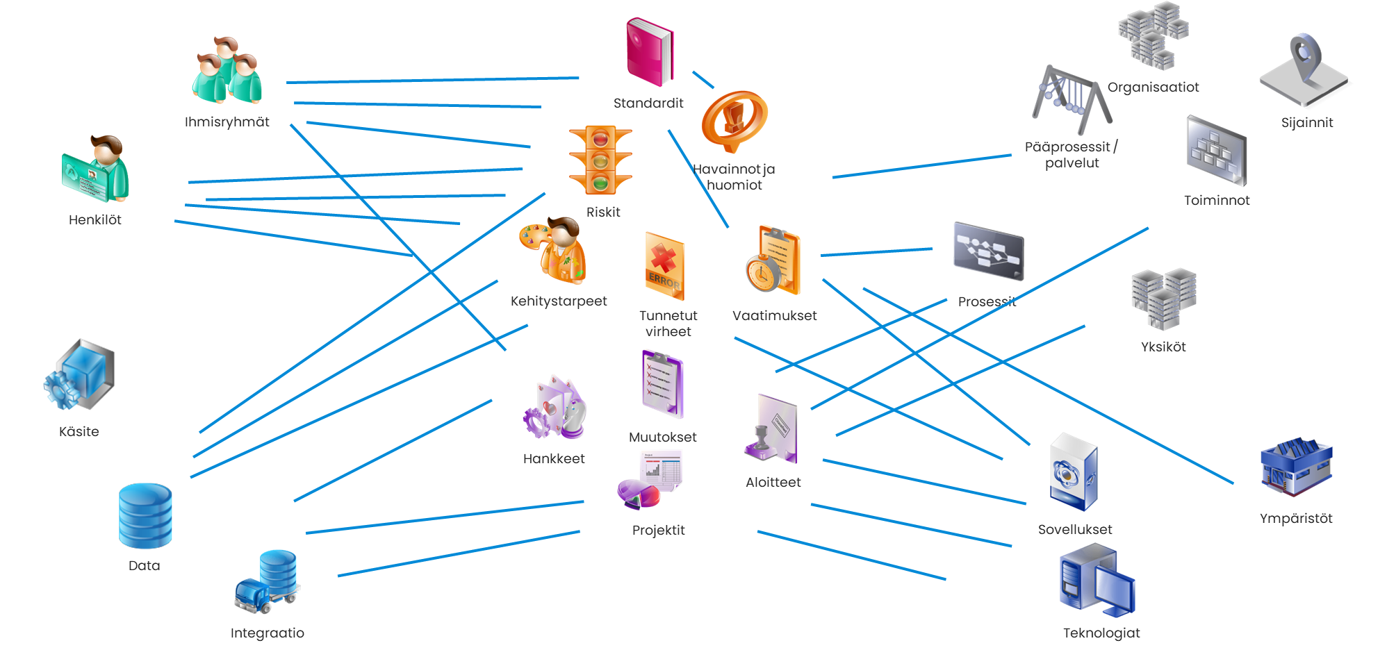 Tämän lisäksi tarkoituksena on mahdollistaa tähän kokonaisuuteen liittyvän kehittämisen hallinta eri tasoilla sekä eri elementtien tason mittaaminen ja yhteensopivuus erilaisiin vaatimuksiin ja viitekehyksiin. Tähän liittyen palvelussa mahdollistetaan erilaisten huomioiden, vaatimusten, riskien ja kehitystarpeiden mallintaminen ja kiinnittäminen arkkitehtuurin eri elementteihin kuten sovelluksiin ja prosesseihin.