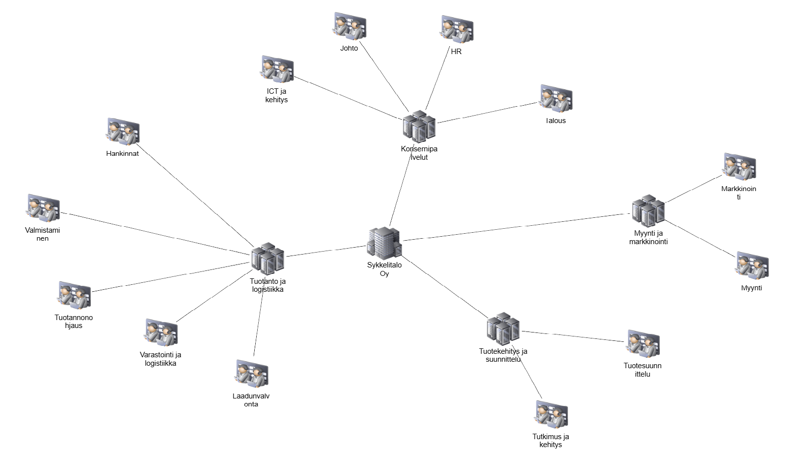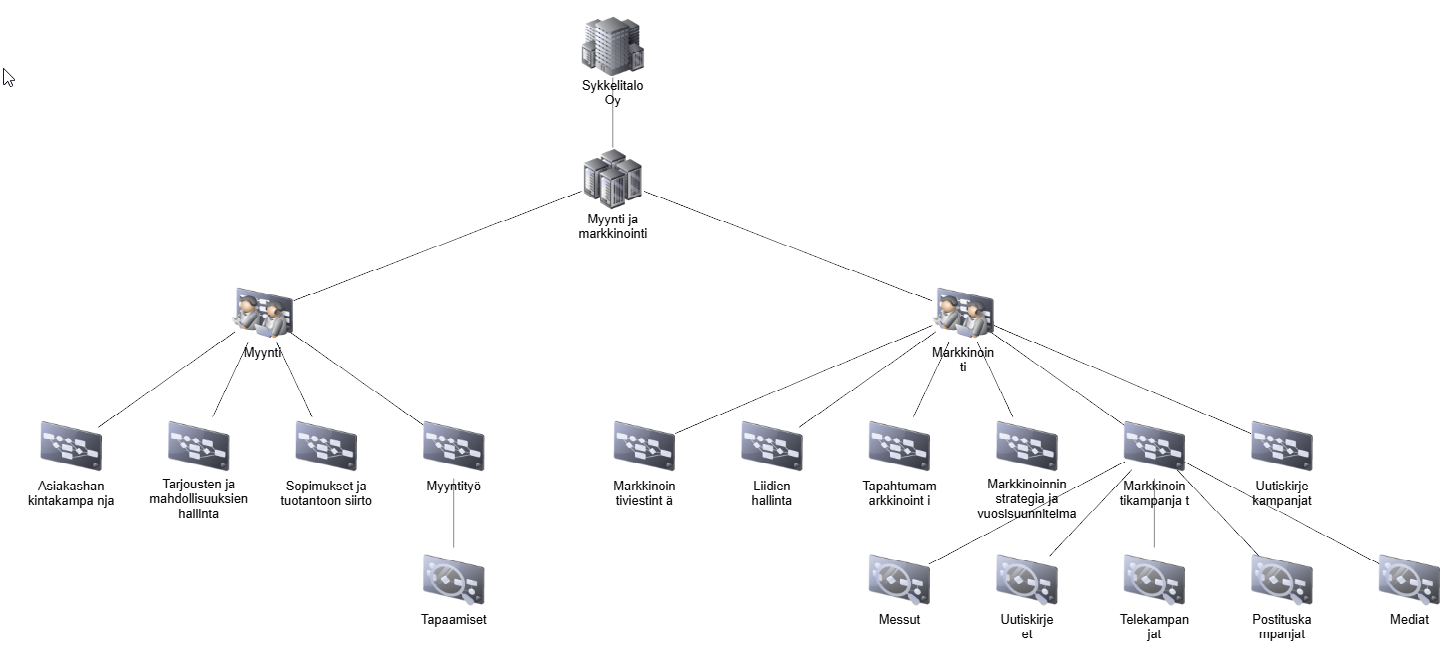Koko digitaalisen kaksosen onnistumisen kannalta prosessirakenne on keskeinen ja sen tulee kuvata toimintaympäristöäsi mahdollisimman oikein ja tasapainoisesti. Mikäli tämä kaavio ei näytä oikealta, on kokonaisuutta suositeltavaa tarkastella tarkemmin, ennen kuin liiketoiminnan elementteihin aletaan sitoa muita arkkitehtuurin elementtejä.