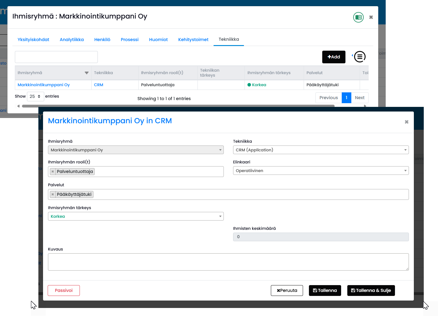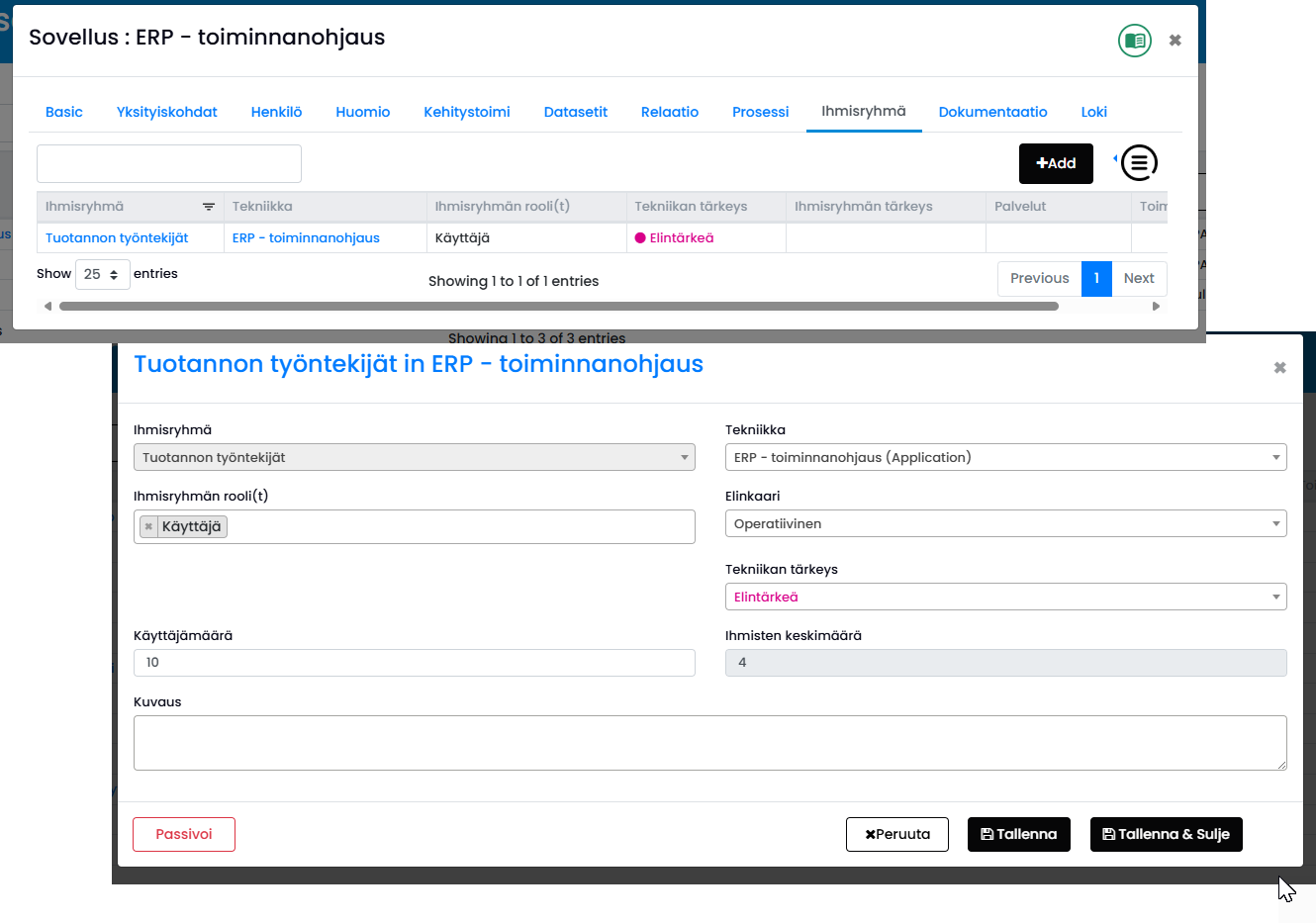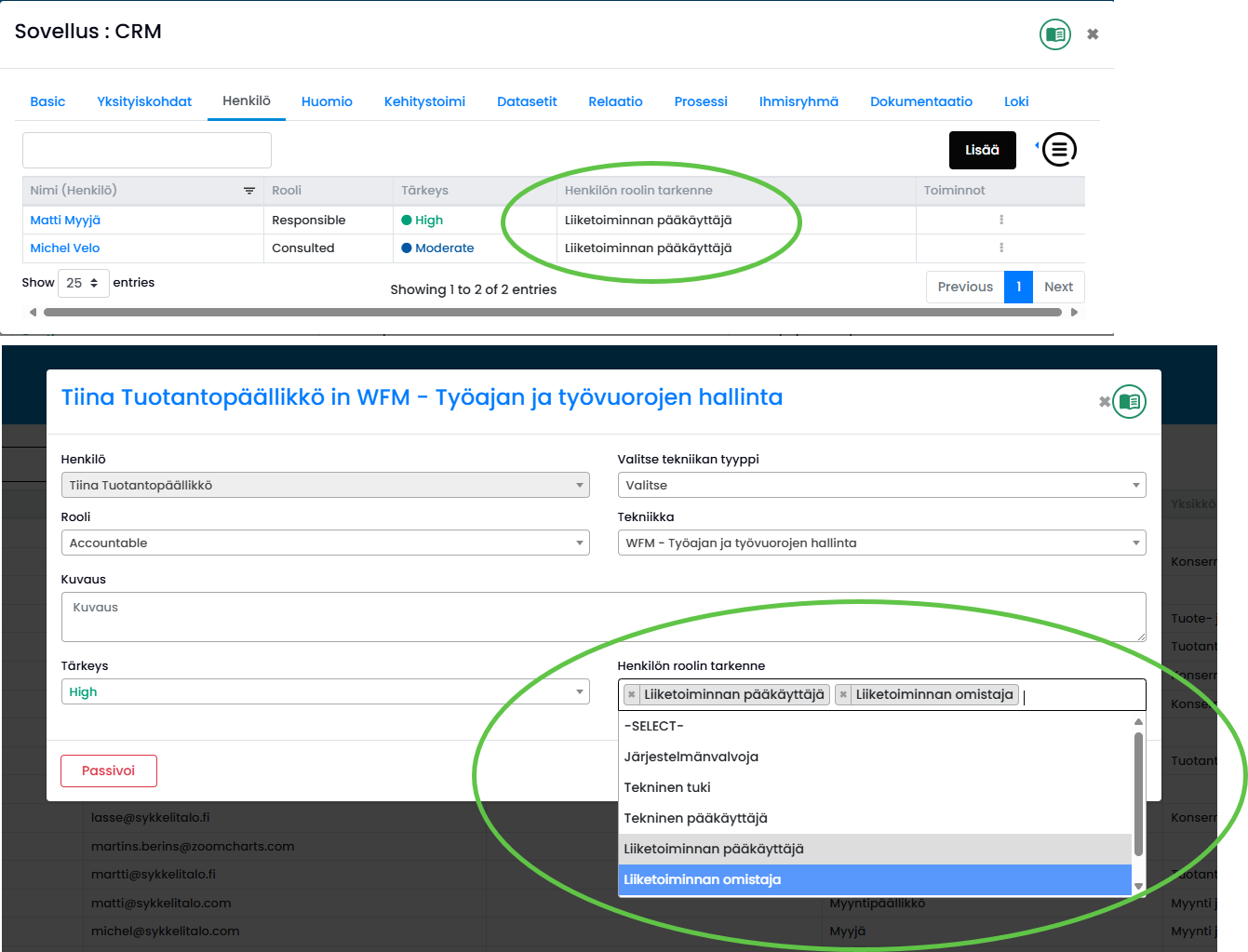 Henkilön roolit kuten järjestelmänvalvoja, liiketoiminnanpääkäyttäjä ja järjestelmän omistaja sovelluksella, tekniikalla tai IoT:lla ovat nyt mukautettavia. Listat on esikonfiguroitu aikaisemman mukaisesti ja ainoa minkä muutoksesta heti huomaat ovat kielikäännökset, mikäli käytät suomenkielistä versiota. Pääkäyttäjät voivat halutessaam mukauttaa "henkilön roolin tarkenne" -valintavaihtoehtoja vastaamaan organisaatiosi nimeämiskäytäntöjä.